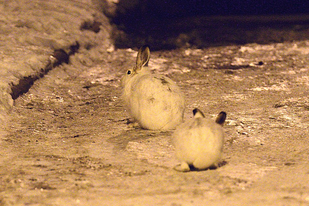I have dealt with Brent for the last year or so at my local camera store, he had mentioned that he would like to grab some owl shots sometime. With my recent successes I thought that it might be a good time to get him our for a "tour". He was right on time at 7:30 a.m. While I was waiting for him I grabbed this quickie of two of the neighbourhood white-tailed jackrabbits. I think they look okay considering I only had the street light for illumination.
