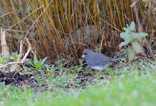 A couple of other sightings in the yard today were Dark eyed Junco's there were about 6 of these ground birds running around scratching up chow. There was also a lone Song Sparrow. Here is a shot of the Junco.